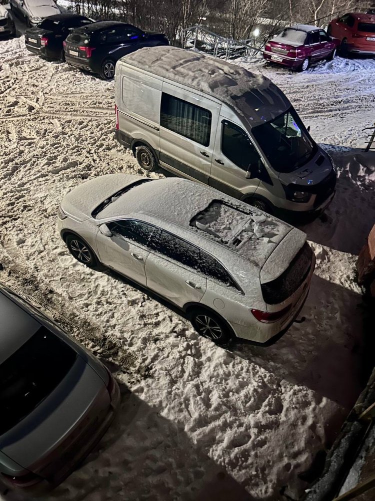 Заезжал на Корабельную два в Штаб квартиру "Улицы 51" С балкона обнаружил такую картину. Походу глыба с крыши прилетела. Хозяину сочувствую. Будте осторожны с выбором парковки.