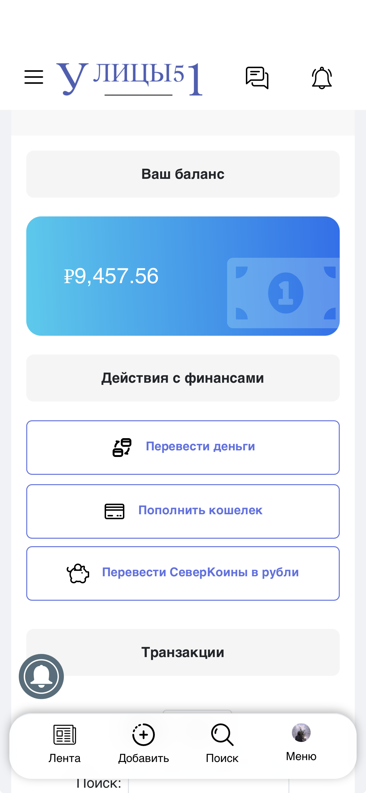 - Кошелёк доступен через меню профиля (нажмите на аватар в нижнем меню).
